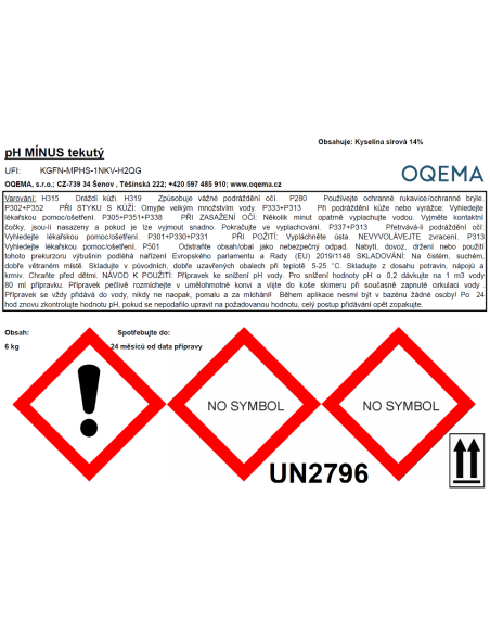 Tekutý přípravek pro snížení hodnoty pH bazénové vody. Používá se. pokud je hodnota pH vyšší než 7,6. Voda ke koupání má mít hodnotu pH v rozmezí 7,2 - 7,6. V tomto rozsahu je zaručeno nejúčinnější působení chlorových přípravků bez vedlejších vlivů. Hodnotu pH proto kontrolujte minimálně 2x týdně a okamžitě regulujte odchylky od ideální hodnoty (hlavně je nutná kontrola před přidáváním chlorových přípravků). Hodnota pH přes 7,6 může způsobit ve vodě mléčné zákaly (vysrážení vápníku), snížení účinnosti chlorových prostředků, zápach po chloru, podráždění očí a pokožky a také může vést k ucpání filtračního zařízení. Při hodnotách pH pod 7,2 může docházet ke zvýšené korozi kovových částí bazénů, blednutí barev materiálů ze kterých je bazén vyroben a také k podráždění očí a pokožky.