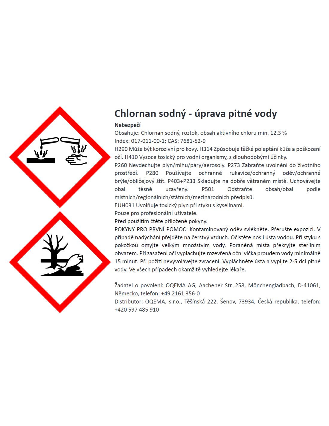 Chlornan sodný osvědčený přípravek k chloraci bazénové či pitné vody. Přípravek se běžně používá pro úpravu vody ve veřejných koupalištích. Doporučená denní dávka je 7g/m³.